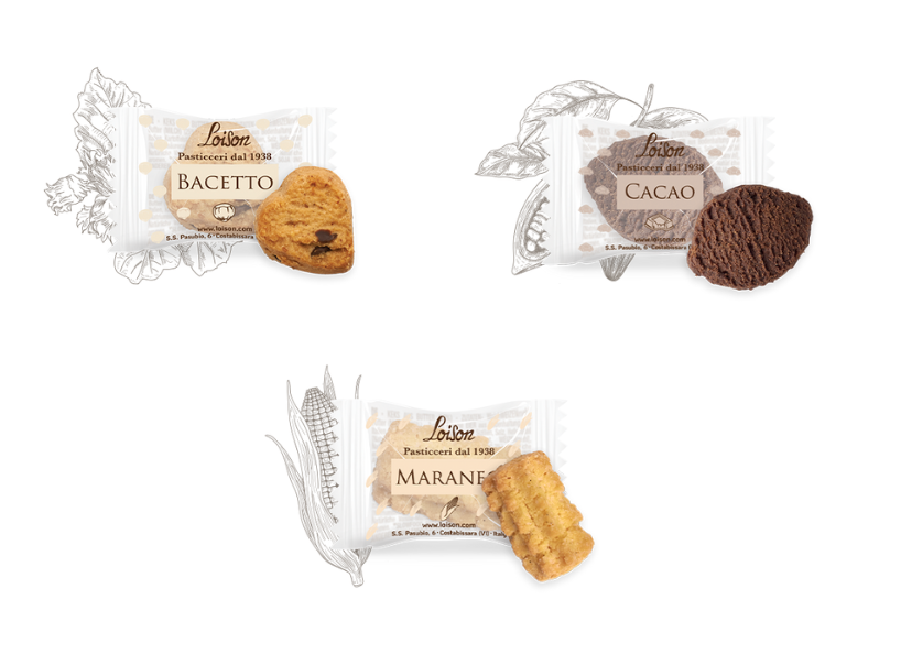 Piškoti Bacetto, Kakav in Maraneo v papirnati torbici so majhne in edinstvene ročno izdelane dobrote, pripravljene iz odličnih sestavin in izbranega svežega masla. Pakiran v posameznem zavitku, ostane vsak piškot dišeč in bogatega okusa.