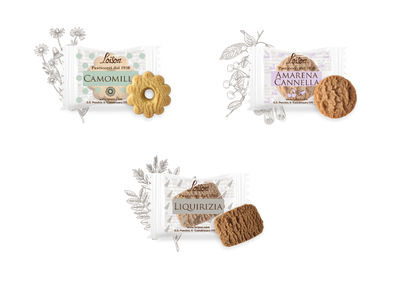 Piškoti z okusi kamilica, sladki koren in amarena s cimetom v papirnati torbici so majhne in edinstvene poslastice pripravljene po tradicionalnih receptih in z odličnimi sestavinami, kot so sveže maslo , kalabrijski sladki koren, rimska kamilica, sicilijanske limone in vanilija Mananara z Madagaskarja.
