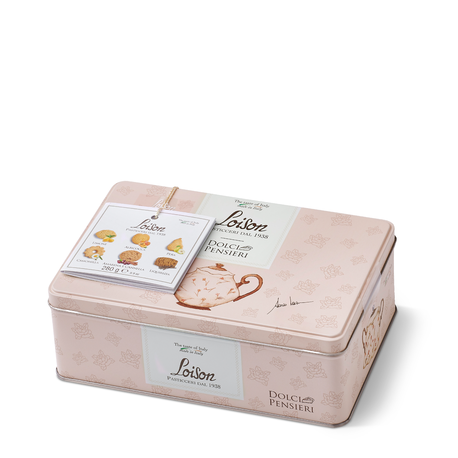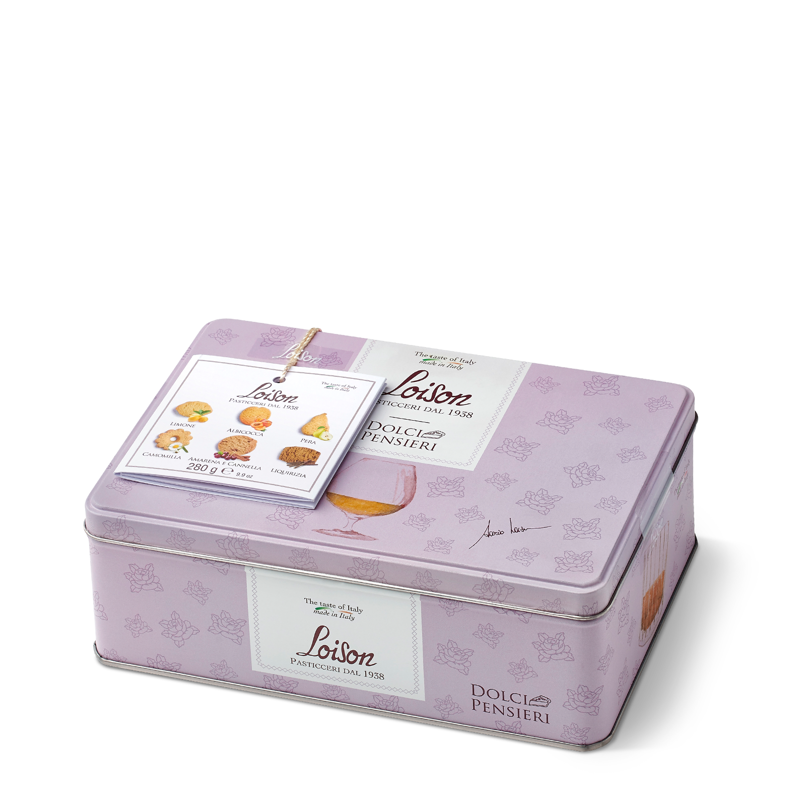 Piškoti z okusom limone, marelice, hruške, kamilice, sladkega korena in višnje s cimetom v pločevinki so majhne in edinstvene ročno izdelane dobrote, pripravljene po tradicionalnih recepturah in iz izbranih vrhunskih sestavin. Med njimi najdemo sveže maslo, kalabrijski sladki koren, rimsko kamilico, sicilijanske limone ter vaniljo Mananara z Madagaskarja, zaščiteno z oznako Slow Food presidium.