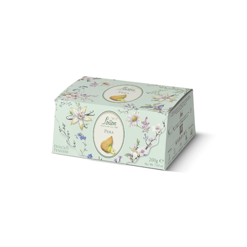 Oblika piškota spominja na hruško, sadež, katerega okus in aroma se v njem popolnoma razkrijeta.